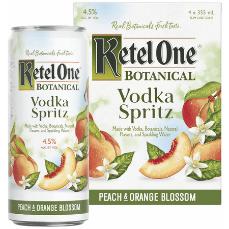 Artfully infused with real botanicals, natural fruit essence and sparkling water, Ketel One Botanical Vodka Spritz Peach & Orange Blossom offers an enticing new way to enjoy Vodka. Made with exceptionally smooth, Non-GMO Ketel One Vodka.